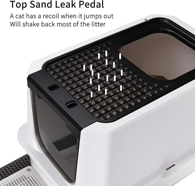 - 【Sand Leakage】 The top of the litter box features many small, wave-shaped, dense holes so that it filters out the litter that your cat brings out on its paws when it jumps out of the litter box. The litter will fall back into the basin through the small holes, avoiding falling onto the floor and minimizing your cleaning troubles.