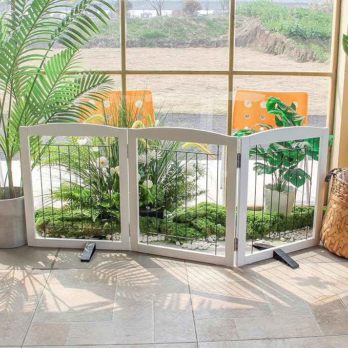 - 【Simple and Firm】This convertible wooden dog gate is a pet fence, room divider, and pet pen all in one. It combines wood and electroplated steel bars. Equipped with non - slip rubber feet, it protects your floor.