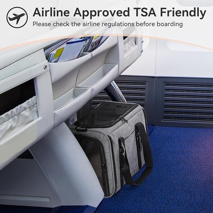 PETSFIT Soft-Sided Cat Carriers & Car Seats with Patent Safe Buckles, Clip-On Harness,18"x11"x11" Airline Approved Pet Carrier - 9 lbs Capacity,Grey