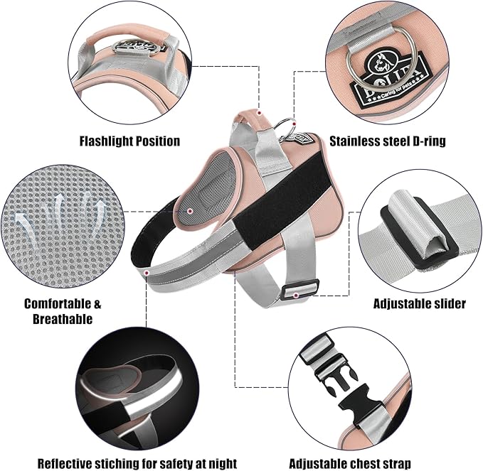- OUTDOOR HEALTHY: Puppy no pull dog harness with reflective straps to ensure your dog is highly visible and keep dogs safe at night. You can connect the dog leash on the D-ring and with handle is easy to control on crowded streets. The high-end pet harness is perfect for daily walking, running, hiking, training, hunting, outdoor adventure and more!