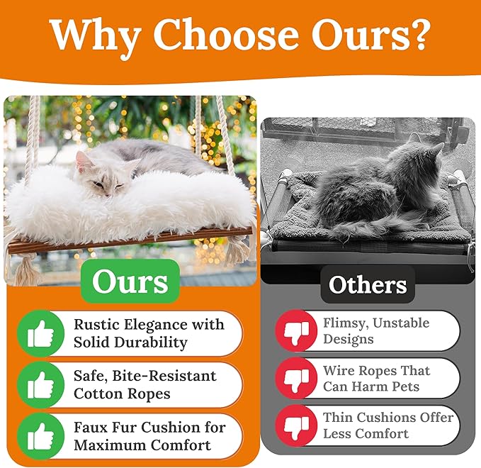 - Timeless Aesthetics: Unlike other perches resembling pipes and metal ropes, our rustic cat window shelf stands out, offering a visually appealing and stylish addition to your home decor while providing furry comfort for your kitty.