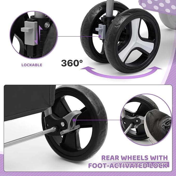 - Advanced Wheel Suspension, Braking & Safety System: Designed for stability, maneuverability, and control, our pet stroller features 360Β° swivel front wheels for effortless navigation, while the shock-absorbing rear wheels ensure a smooth, stable ride on various terrains. For added safety, the dual rear-wheel braking system provides a secure stop on slopes and uneven surfaces, giving pet owners peace of mind during strolls