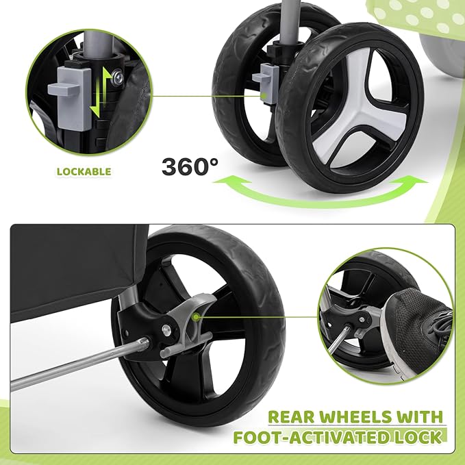 - Advanced Wheel Suspension, Braking & Safety System: Designed for stability, maneuverability, and control, our pet stroller features 360Β° swivel front wheels for effortless navigation, while the shock-absorbing rear wheels ensure a smooth, stable ride on various terrains. For added safety, the dual rear-wheel braking system provides a secure stop on slopes and uneven surfaces, giving pet owners peace of mind during strolls