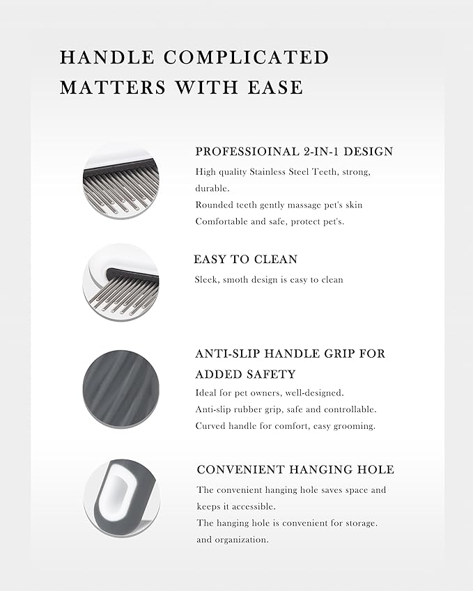 - πΎ The combs are engineered to perfection. Take the metal dog comb, for instance, it is exceptionally durable and highly efficient, making grooming a breeze. The cat brush is thoughtfully tailored to cater to the unique needs of our feline companions, guaranteeing a gentle yet effective grooming session.