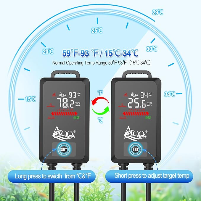 - Intelligent Automatic Heating: The AQQA fish tank heater adopts automatic constant temperature control. When water temp reaches the set temp, it will stops heating; when the water temp falls lower than the set temp by 2β/Β°F, it will automatically heat up again; Memory function allows no need to reset the temperature after a power outage, so it is more convenient to unplug and change the water.