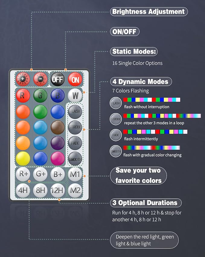 - 4 Lighting Modes: Based on red, green, and blue, the multicolored LED lights are combined to create a full spectrum, bringing 4 dazzling lighting modes β Flash, Strobe, Fade and Smooth. Customize the most captivating effects and enjoy a visual feast!