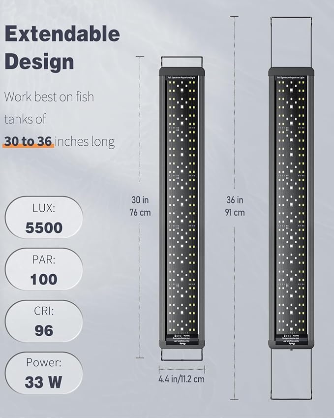 - For 30" to 36" Tanks: With an extendable bracket (min length: up to 29"; max length: up to 44"), the LED aquarium light always stays steady on the fish tank. Work best on tanks of 30 to 36 inches long