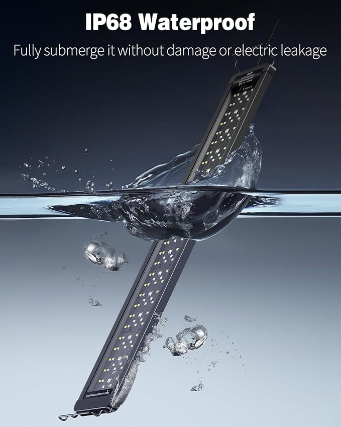 - D/N Mode: Customize the daytime and night working hours with the IP68 waterproof fish tank light. Daytime duration: 6 h, 8 h and 10 h; Night duration: 2 h, 3 h and 4 h. Simulate the daylight and moonlight to create a natural environment