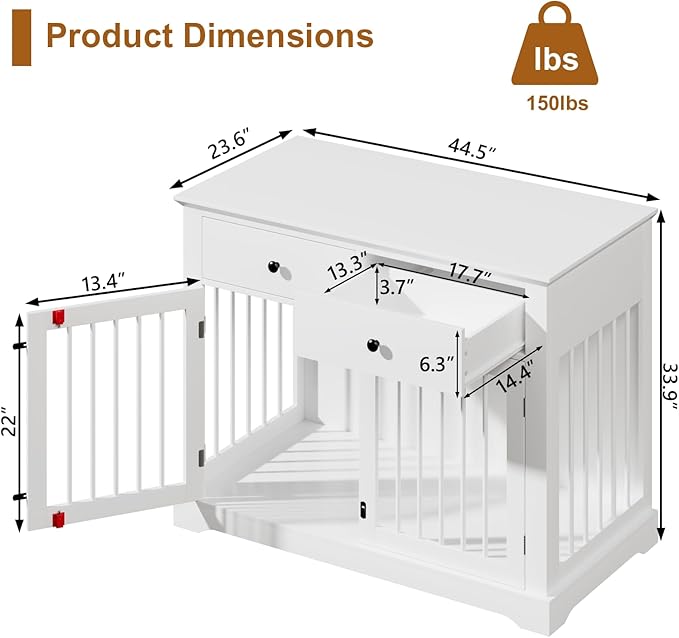 - Double Large Drawers: This decorative wood dog crate kennel has the wide desktop that you can display decorations such as plants, magazines, picture frames, night light and so on. And it equipped with 2 drawers, which provide extra storage space.Perfect for storing dog supplies (toys, leashes, etc.) or others