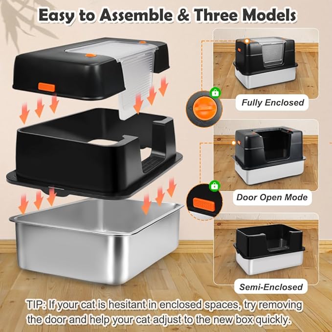 - THREE VERSATILE MODES - Our extra large litter box offers three modes: fully enclosed for maximum odor control to keep your home fresh; open door for added privacy and visibility, helping cats adjust to the new box; and semi-enclosed for optimal airflow and easy cleaning, especially for cats wearing collars