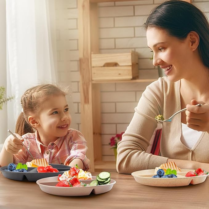 greenandlife 9 Inch 4PCS Unbreakable Portion Control Plates, Divided Plates for Kids Adults, Dishwasher & Microwave Safe Compartment Plate, Lightweight Reusable Wheat Straw Plate, BPA Free