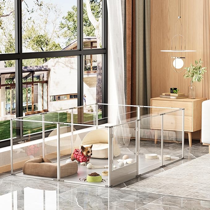 - Clear Acrylic Fence Design - Crystal-clear acrylic dog fence playpen enables you can interact with your pets closely, 360Β°high transparency and wide vision, itβll relieve your pets from anxiety, they also make sure you are by their side, equipped with a door for dog mom/ pets to come and go easily, so this is a unique gift for your loved friends, get this fence in the room, instantly upgrade your home space