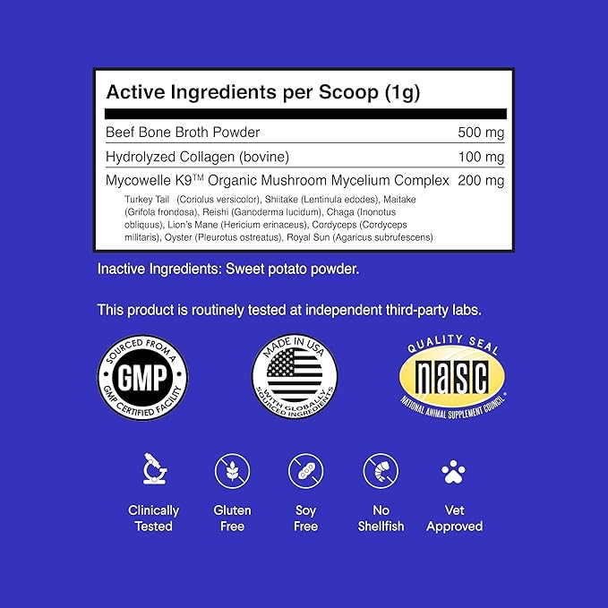 - NASC CERTIFIED: Wonder Paws is a member of the prestigious National Animal Supplement Council (NASC), which ensures strict quality control standards. Wonder Paws pet bone broth complex is NASC Certified so you know you are getting a trusted product that adheres to stringent quality controls. Our beef bone broth powder supplement with mighty mushrooms and collagen is manufactured in the United States with globally sourced ingredients an FDA registered and GMP Certified facility.