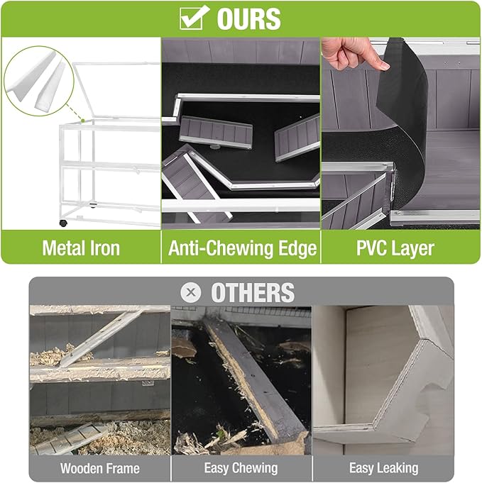 - PVC Flooring for Protection The PVC floor is chew-resistant and prevents urine from seeping into the wood, eliminating unpleasant odors and ensuring a long-lasting cage.