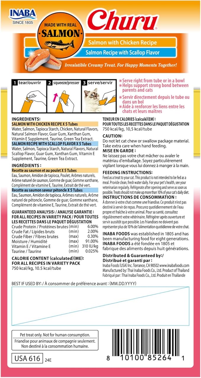 INABA Salmon Churu Cat Treats, Lickable, Squeezable Creamy Purée Cat Treat with Green Tea Extract & Taurine, 0.5 Ounces Each Tube, 10 Tubes, Scallop & Chicken Variety