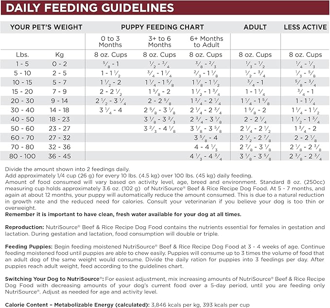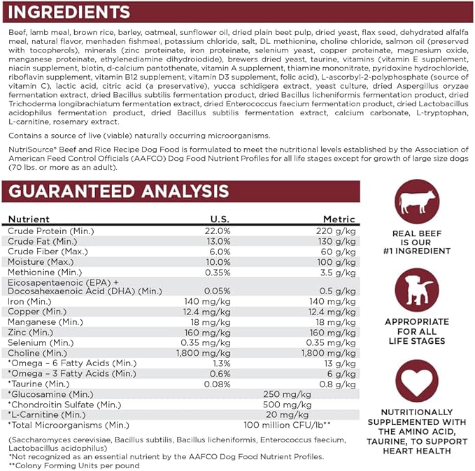 - As a member of our grain inclusive series, NutriSource Beef and Rice Dry Dog Food is formulated to meet AAFCO guidelines for all lifestages
