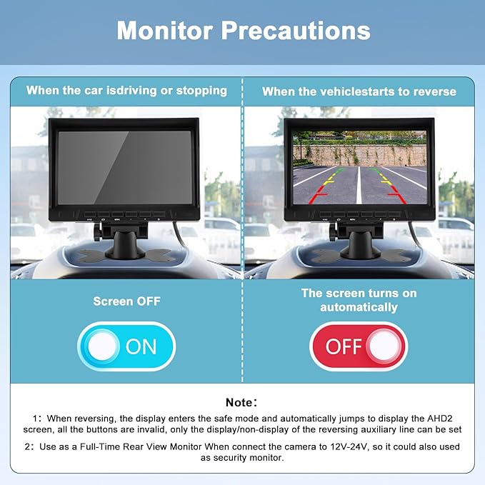 - Two-way Video Input: The RV camera system has a dual-camera function, which is perfect for backing up safety and other uses. When you connect the truck trailer with back-up camera to 12V-24V then full-time rearview monitor as a camera, it can also be used as a security monitor. It can also be used as a safety monitor when you connect the camera to the back-up lights. You can switch each channel as needed. If you need additional cameras, please contact us