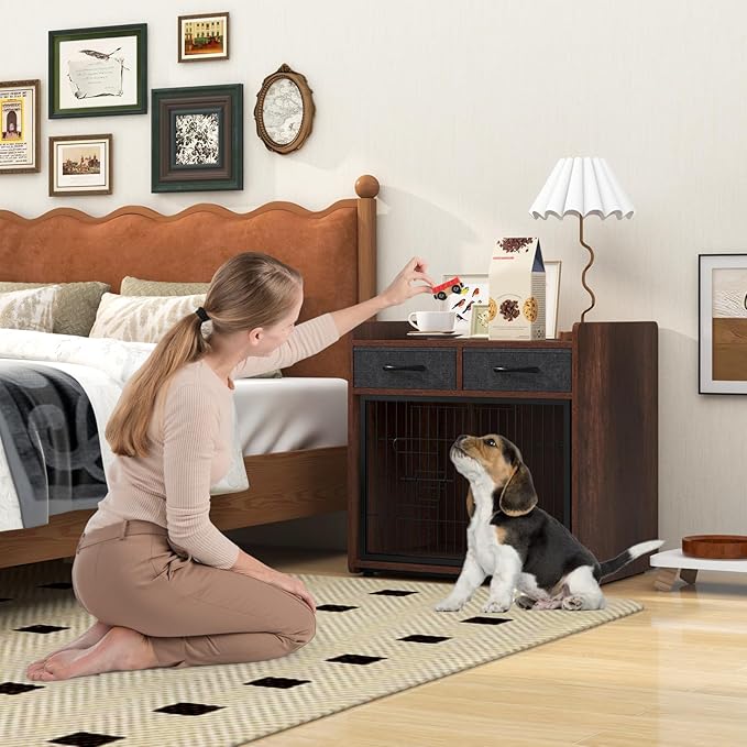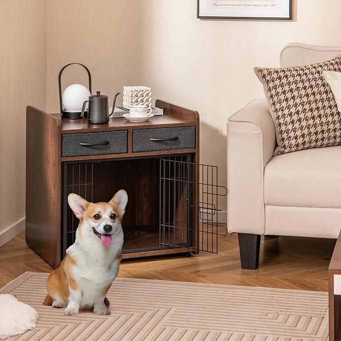 PETISITE Wooden Dog Crate with Lockable Door, Adjustable Foot Pads, 2 Fabric Drawers, Indoor Kennel Side Table for Small & Medium Dogs, 24.5 x 19.5 x 25 in