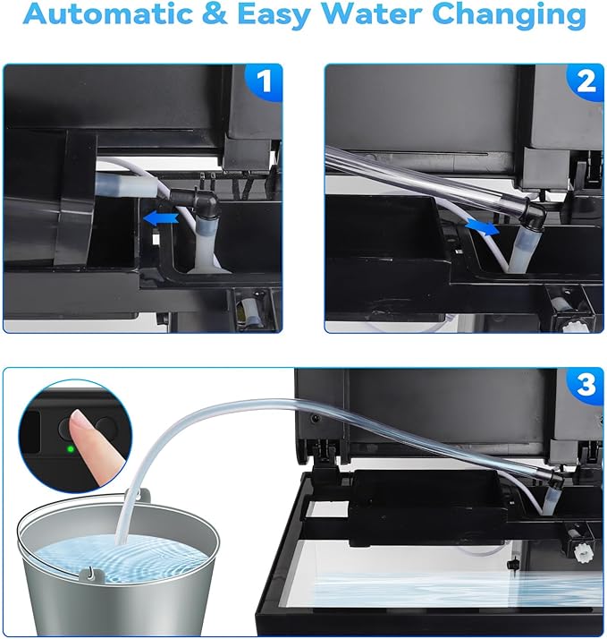 - Built-in 3-in-1 Filter System: The desktop fish tank is equipped with a quiet, hidden pump that provide filtration, oxygenation, and water circulation, creating a healthy environment for your fish while reducing maintenance. It also comes with a hose for easy water changesβjust connect it to the pump for a quick and hassle-free water exchange, keeping your tank clean with minimal effort.