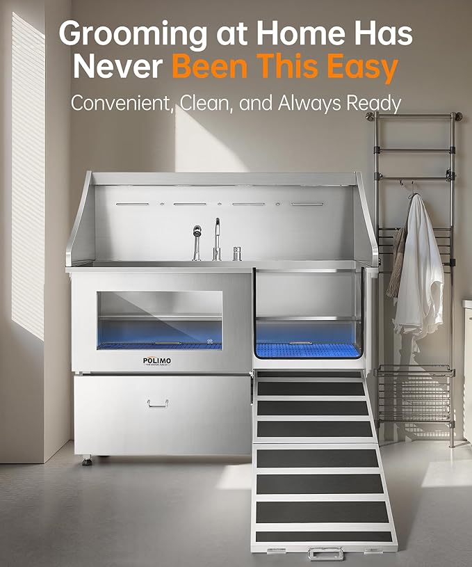 - Innovative and Practical Design: The POLIMO dog grooming station features multiple outstanding design elements: β IP65 Waterproof high-brightness LED spotlight. β‘ Grade A tempered glass observation window. β’ The bathtubβs side panels feature a curved slide design, making it easier to operateβ£ Two-piece floor grid, adjustable to three different heights. β€ Sliding storage drawer for organized storage. β₯ Multi-function faucet and showerhead, adjustable to left, center, or right positions.β¦ Two drainage options are available: one with a pet hair catcher and another stainless steel drain pipe featuring an odor-blocking S-trap design