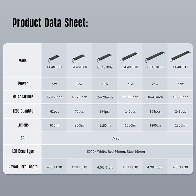 - 【FULL SPECTRUM AQUARIUM LIGHT】 GLOWRIUM Full Spectrum Aquarium Light includes 5000K super bright white LEDs, 460nm blue LEDs and 660nm red LEDs, which greatly promotes photosynthesis in aquatic plants, and its colour reproduction is up to CRI > 90, which provides the optimal light environment for the growth of aquatic plants and ornamental fish.