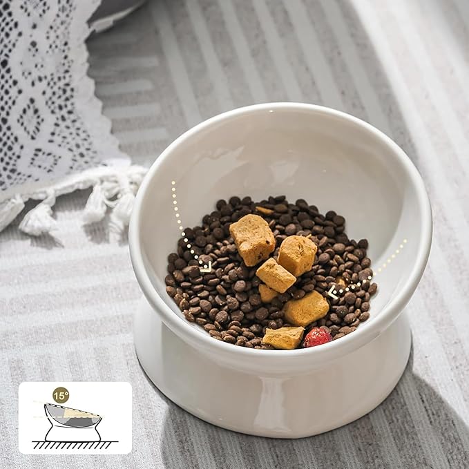 - 【Anti Vomiting】This tilted cat food bowls according to animal morphology, the feeding angle is designed to be 15° to relieve pressure on the neck during feeding and helps cat swallow more easily, reduce vomiting
