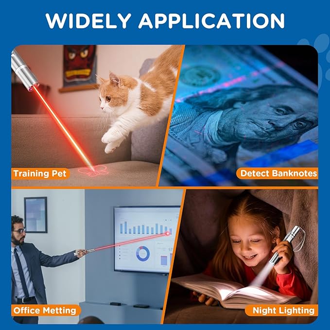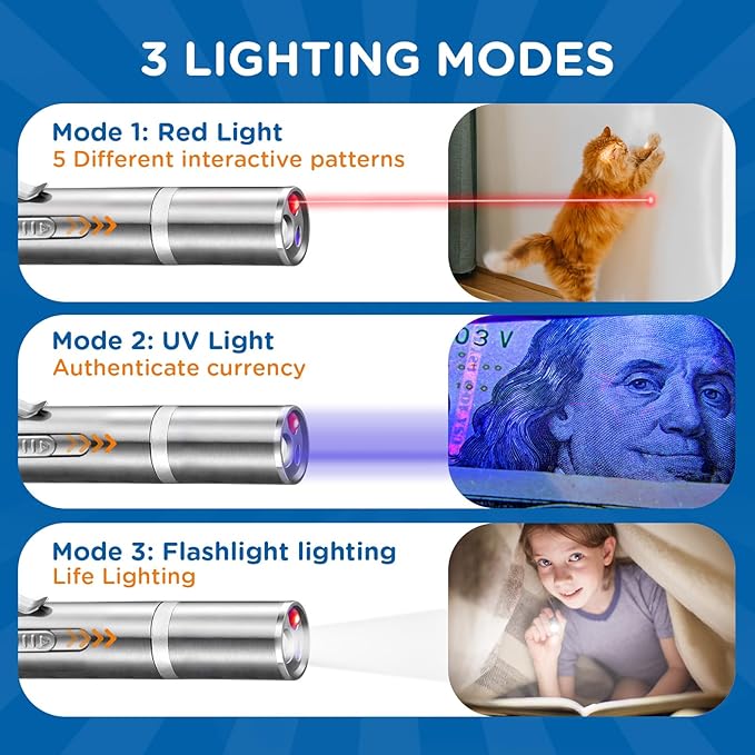 - Multiple Function: The cat light can also make you a presenter. It is bright that you can see clearly, making speeches or explanations easier and more convenient. Whatβs more, you can turn on the switch with a single press instead of holding down on the button to keep lighting like most other cat flashlight do. Lighting mode can glow in the dark. Purple mode can detect counterfeit money.