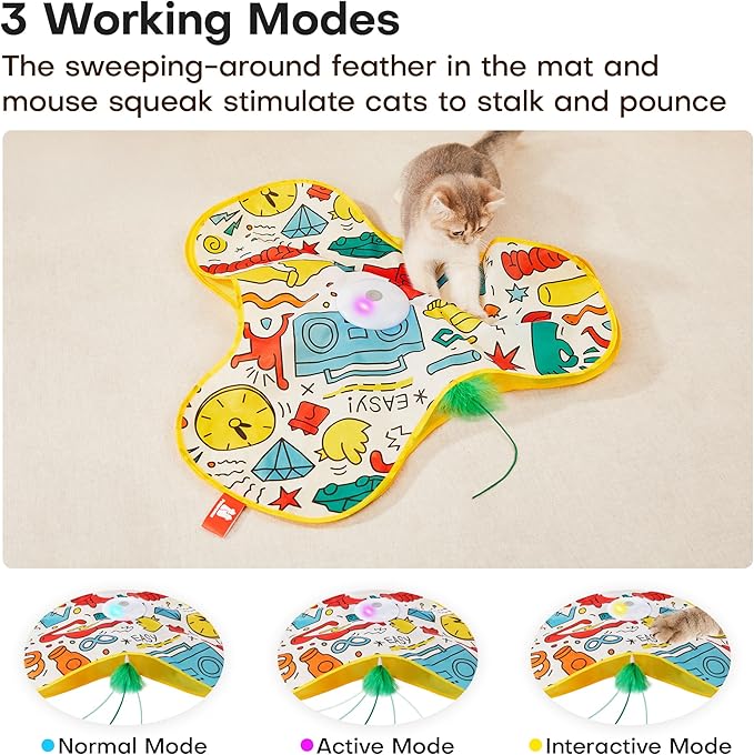 - Durable & Safe Design β The thickened, double-padded mat ensures durability during enthusiastic play, while the easily replaceable feather wand adds to the toyβs longevity. This motorized entertainment buster offers endless chase opportunities for your kitty, making it a must-have for households with high-energy or easily bored cats.
