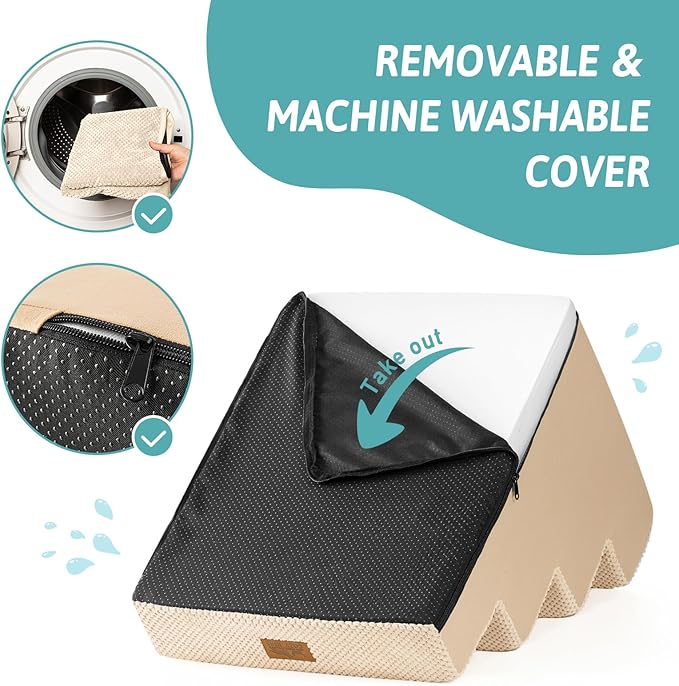 - Non-Slip Base and Removable Cover: Our dog steps for beds are equipped with a non-slip base featuring rubber dots for extra grip, minimizing movement during use. The pet steps cover is waterproof inner side, so you donβt have to worry about stains seeping into the foam. The outer cover is removable and machine washable for easy cleaning
