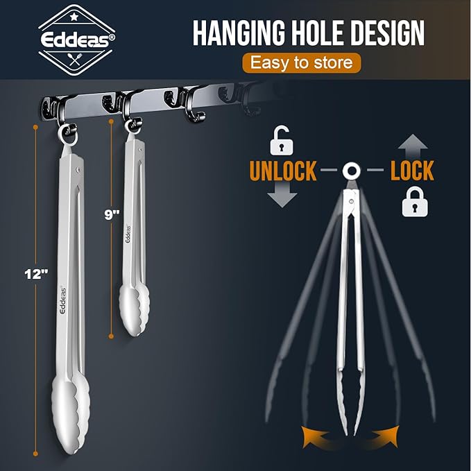 - TWO SIZE 9"&12 in MULTIPLE APPLICATION - Eddeas metal tongs will meet your needs for safety and stability, for everyday kitchen tasks or outdoor use, Used with various meats, salad, sliced fruits, rolls, burger toppings, and fettuccini.