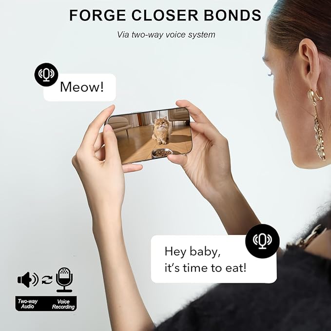 - Built-in 1080P Camera and Microphone for Real-Time Interaction Stay connected with your pets anytime and anywhere. The built-in camera and microphone allow you to watch your pet's mealtime and interact with them through two-way audio. You can even record or take photos of their eating moments, making it easy to share adorable footage of your pets with friends and family.