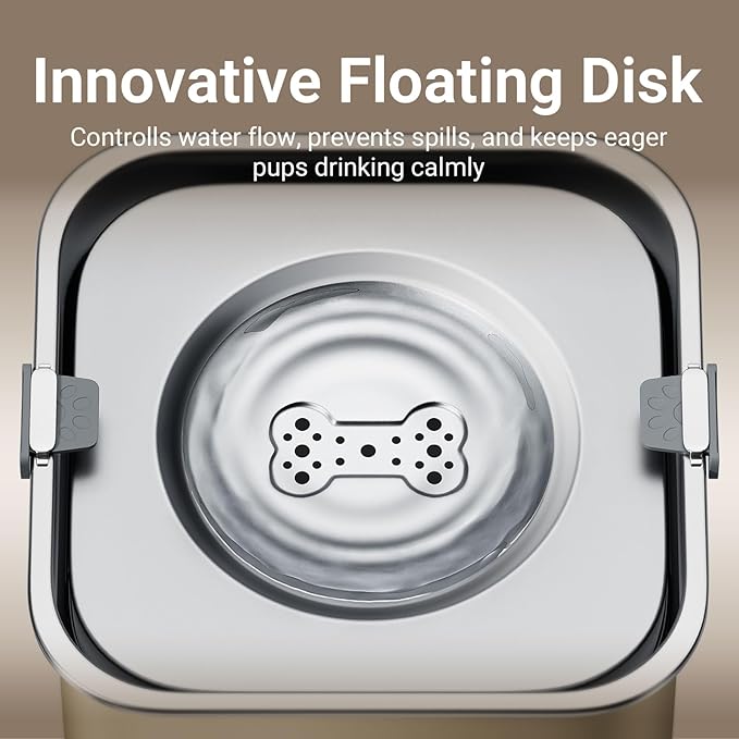 - Floating Disk Design: Controlled Water Flow for a Spill-Free Experience. The advanced floating disk design ensures a steady water flow, allowing your dog to drink easily without splashing.And keeping your dog's muzzle and fur dry while drinking. It prevents spills, keeps your floors dry, and creates a cleaner, more enjoyable environment.