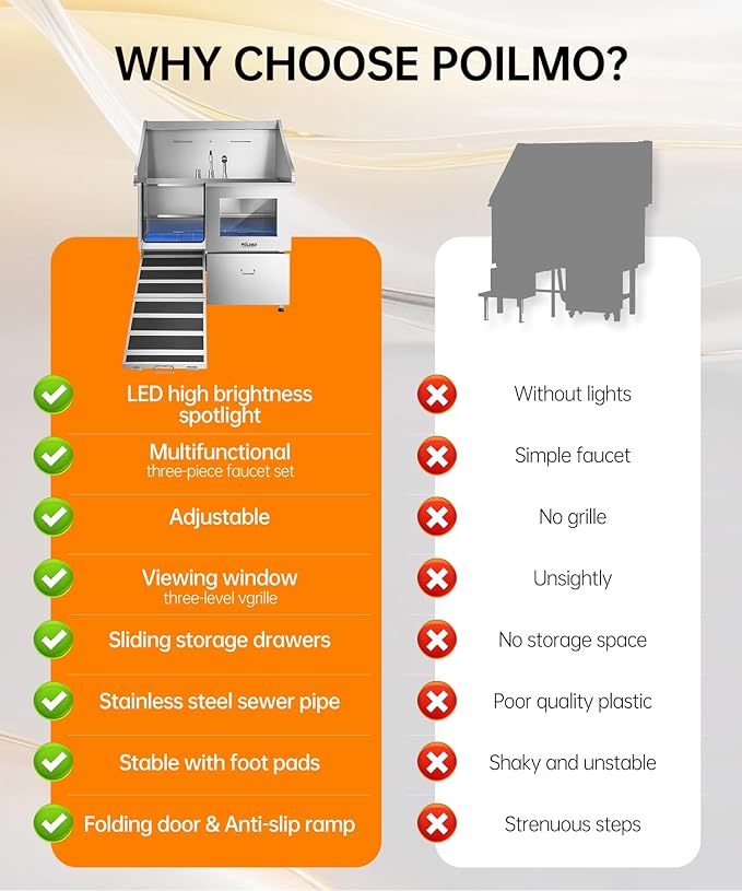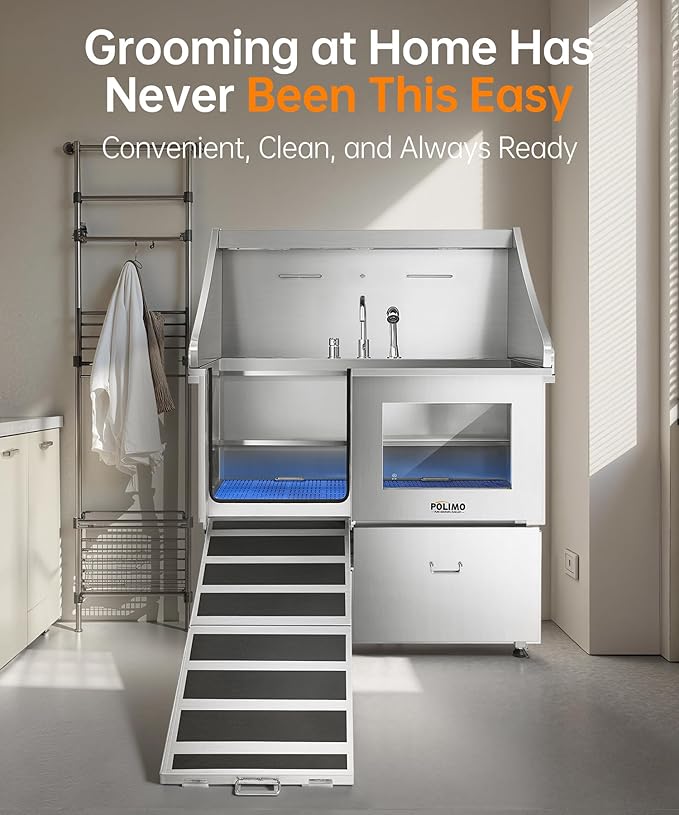 - Innovative and Practical Design: The POLIMO dog grooming station features multiple outstanding design elements: β IP65 Waterproof high-brightness LED spotlight. β‘ Grade A tempered glass observation window. β’ The bathtubβs side panels feature a curved slide design, making it easier to operateβ£ Two-piece floor grid, adjustable to three different heights. β€ Sliding storage drawer for organized storage. β₯ Multi-function faucet and showerhead, adjustable to left, center, or right positions.β¦ Two drainage options are available: one with a pet hair catcher and another stainless steel drain pipe featuring an odor-blocking S-trap design
