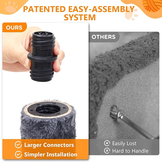 - Patented Easy-Assembly System: Unlike typical cat trees with tiny metal screws (hard to handle & easily lost), our innovative design features extra-thick, high-strength PP connectors—making setup effortless while significantly improving stability.