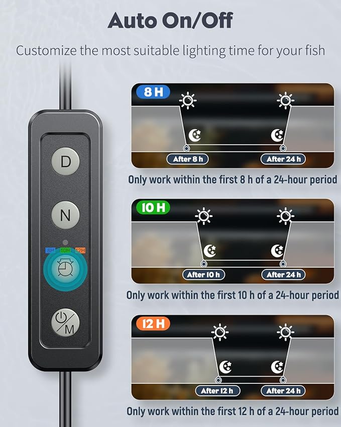 - Auto On/Off: With a built-in timer, the submersible aquarium tube light provides 3 optional lighting durations: 8 h, 10 h and 12 h (Only work during the first 8, 10 or 12 hours within 24 hours). Perfect for creating a natural environment.
