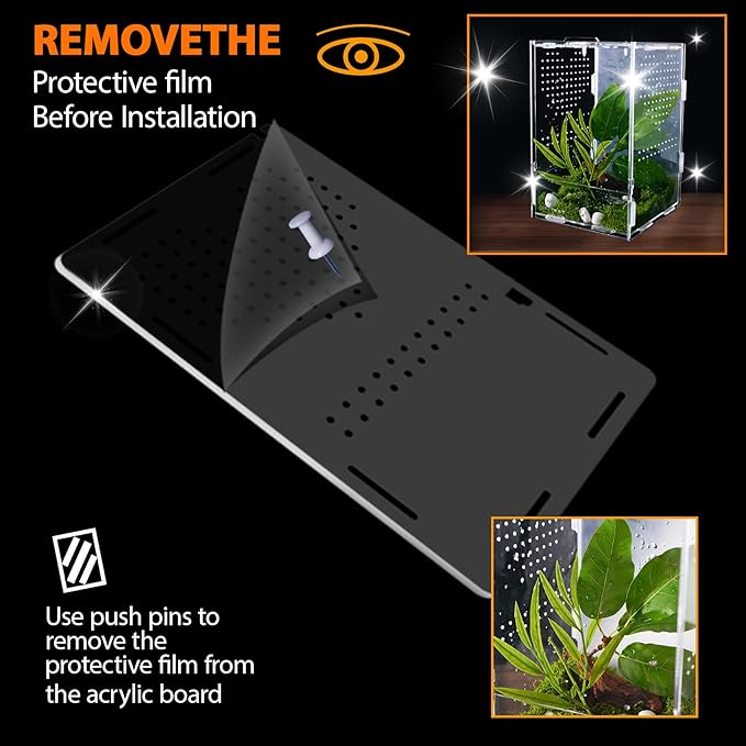 - 【Easy Installation】First tear off the protective film on the surface. Acrylic terrarium tarantula enclosure require only a simple installation, and rubber bands work well to hold everything together. It is also easy to disassemble when not in use, saving storage space.