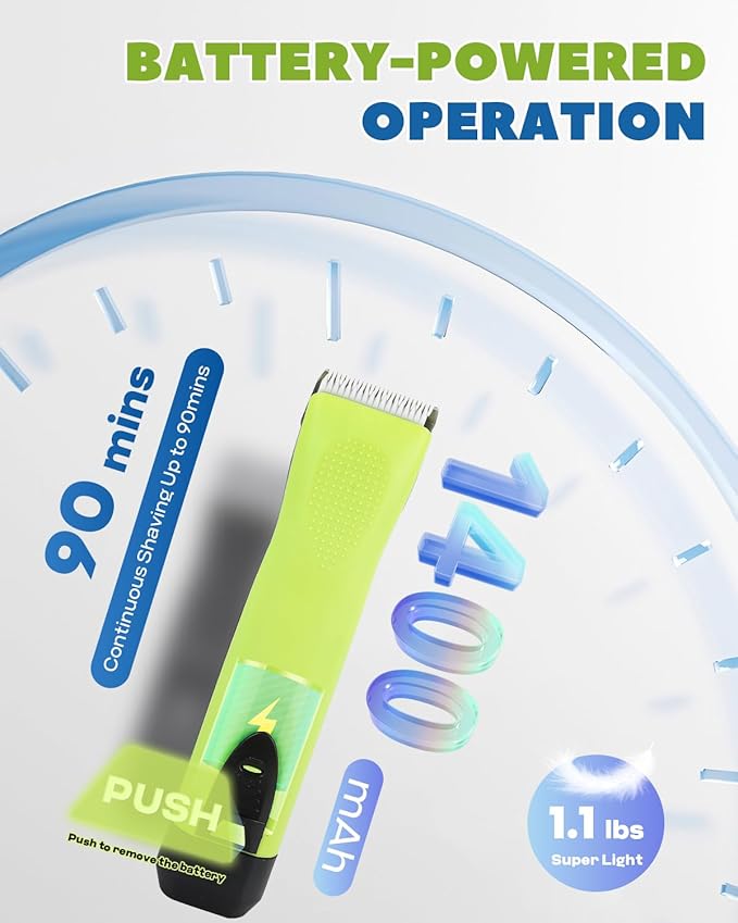 - [Dual Power Options Convenience]: Power Whenever, Wherever! This professional horse shear packs a punch with its 7.4V, 1400mAh lithium battery, delivering up to 90 minutes of uninterrupted grooming in a quick 2-hour charge. And here’s the kicker—this pet clipper hooks up to a 3.5-meter-long charging cable, so you can groom on the go without ever pausing to recharge. No more cord-induced shackles, just pure, uninterrupted grooming freedom.