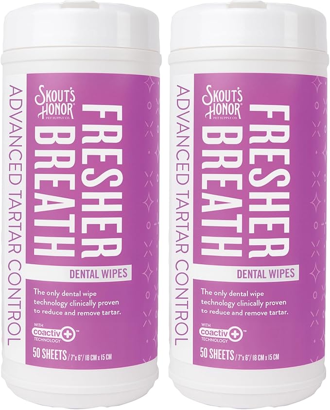 SKOUT'S HONOR Pet Dental Wipes - Fights Plaque and Tartar, Freshens Breath Fast, No Brushing Required, 50 Sheets, 2-Pack
