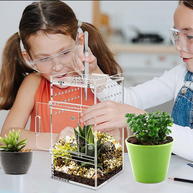 - 【Essential Jumping Spider Enclosure for Pet Owner】The product includes a small jumping spider enclosure, 1 pair of tweezers with 5.5 inches in length, and 1 water suction tube. The acrylic terrarium measures 3x3x6 inches, and its interior can be set up as a mini ecosystem, mimicking the natural habitat of jumping spiders, thus satisfying children's curiosity