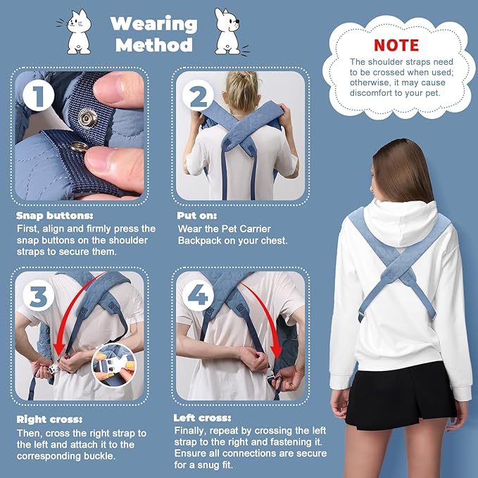 - 【Multiple Pocket Design】: Our Pet Carrier Backpack is equipped with multiple pockets, including two side pouches and front and rear zippered pockets, offering ample storage for essentials like snacks, waste bags, your wallet, phone, or keys. Everything you need is within easy reach. (𝐏𝐥𝐞𝐚𝐬𝐞 𝐧𝐨𝐭𝐞: If you find the straps too long, cross them when using to prevent slipping off your shoulders. For step-by-step instructions, please refer to Figure 4.)