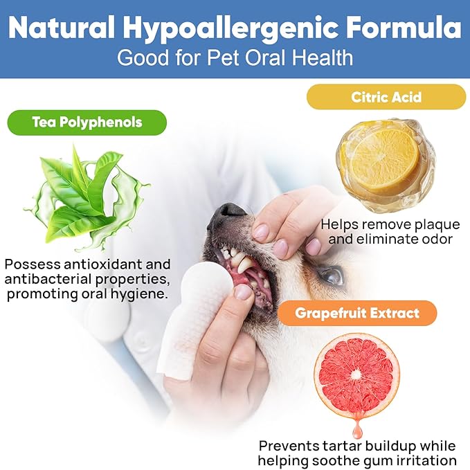 - NATURAL INGREDIENTS - Our dog dental wipes made with all-natural ingredients formula includes EDI purified water, plant enzymes, tea polyphenols, grapefruit seed extract, and citric acid . Alcohol-free, devoid of parabens and fragrances, making it safe even if licked or ingested. The dog dental wipes perfect for pets with sensitive teeth, gums, and enamel.