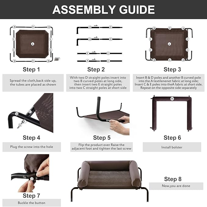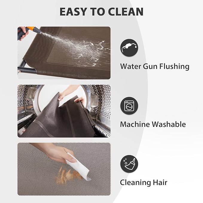 • 【DOG BED EASY CARE】: This cooling elevated dog bed is super easy to clean. Pet hair, vomit, and dust can be quickly wiped away, or you can wash the mesh with tap water, a hose, or a damp towel. For a deeper clean, use mild soap or natural cleaning agents. No more worries about pet odors, dirt, or excessive hair. (Note: Wash the U-shaped pillow separately with pet shampoo.)