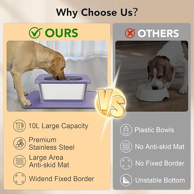 Decflow 10L Stainless Steel Dog Water Bowl, No Spill Anti-Splash Dog Bowls with XXL Silicone Mat, Spill-Proof Slow Feeder for Messy Drinkers, Heavy Duty Pet Bowls for Indoor/Outdoor Use Purple