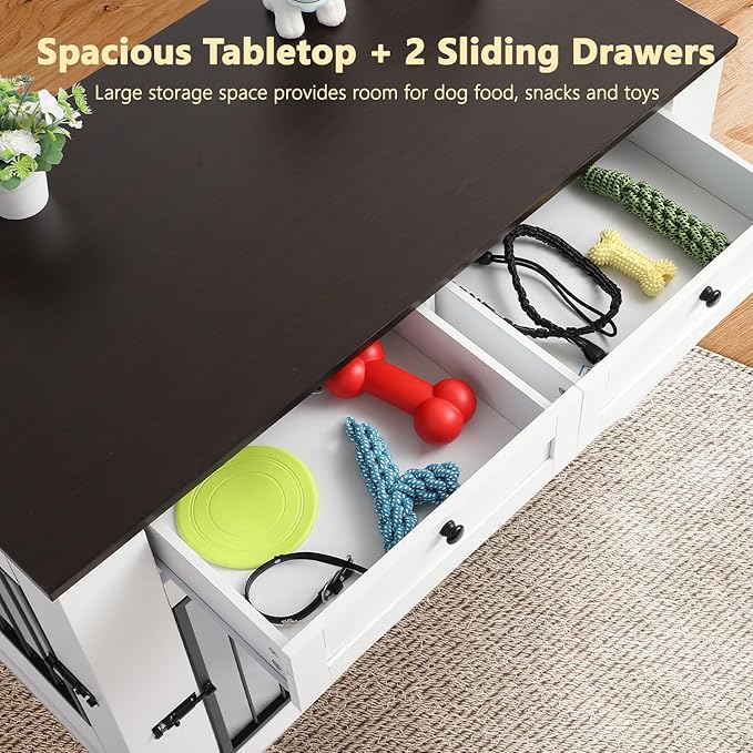 - Storage: Our dog kennel furniture features a spacious 47.2 "L x 23.8"W table top that can be used to display photo albums, potted plants or decorations. Load capacity up to 180 pounds. Two equal sized drawers for your dog's toys, clothes, etc. These Spaces are enough to keep your dog's toys, bowls, food, etc. tidy and organized