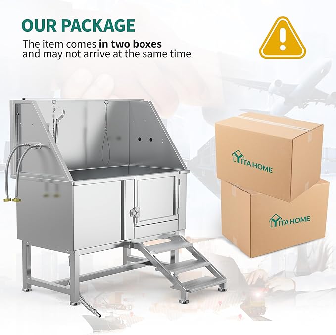 - Ideal Construction: YITAHOME professional dog bathtub’s body boasts a 304 stainless steel with a load capacity of 330 lbs; It resists deformation and rust, ensuring easy cleaning and lasting durability; The fully welded one-piece design prevents water leakage and allows easy installation