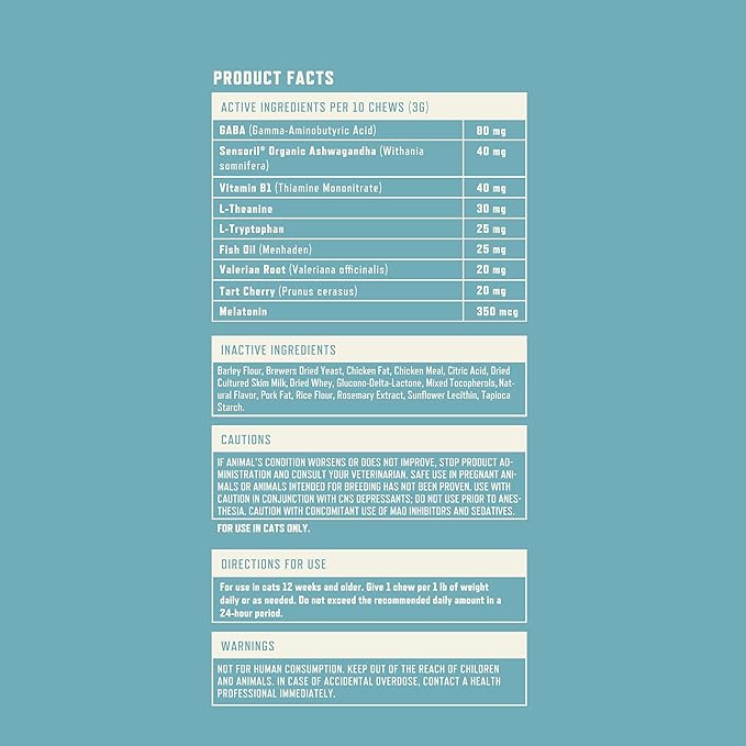 - Unparalleled Support: Our delicious, chicken-flavored chews help keep your cat cool, calm, and relaxed; Every bite promotes a sense of relaxation and mental alertness to help maintain normal stress levels during thunderstorms, vacuuming, moving, vet visits, and other stressful situations