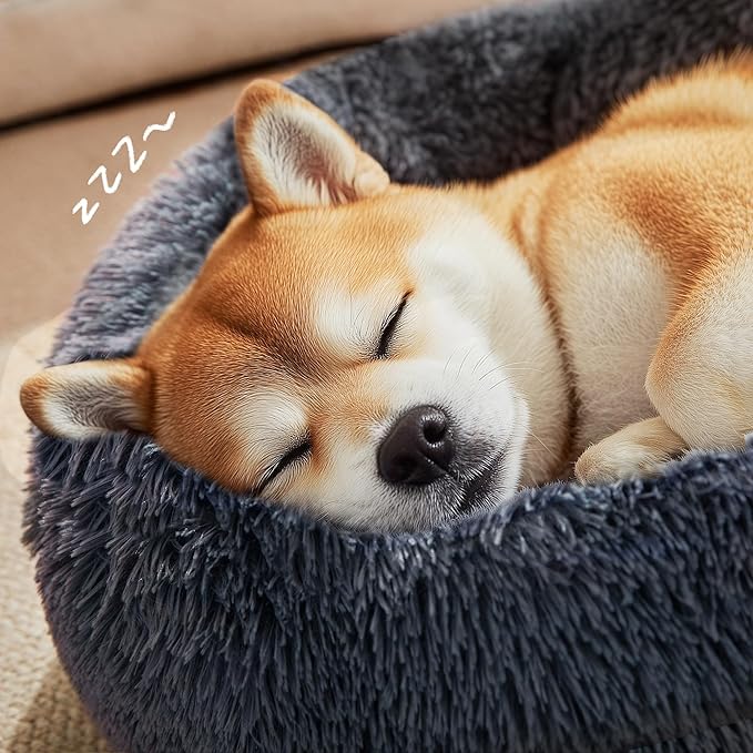 Love's cabin Calming Dog & Cat Bed, Cat Bed for Indoor Cats,Anti-Anxiety Donut Round Dog Bed,Fluffy Faux Fur Washable Bed for Small Medium Pet,Beige,Bluish Grey,30"