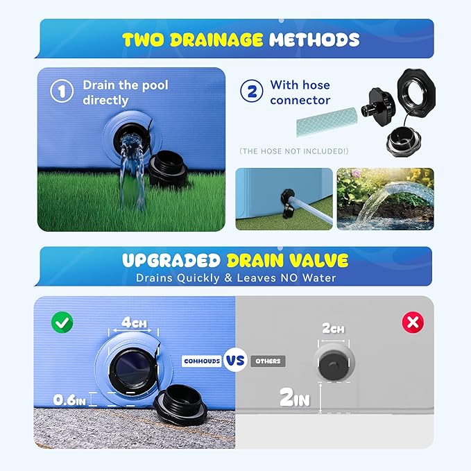 - Quick Drainage System: Our kiddie pool is designed for quick and efficient water release, featuring a drain valve just 0.2 inches from the bottomβlower than most poolsβfor faster drainage. The large 0.8-inch valve ensures minimal water residue. Additionally, we include a hose adapter so you can easily redirect the water and avoid backyard flooding