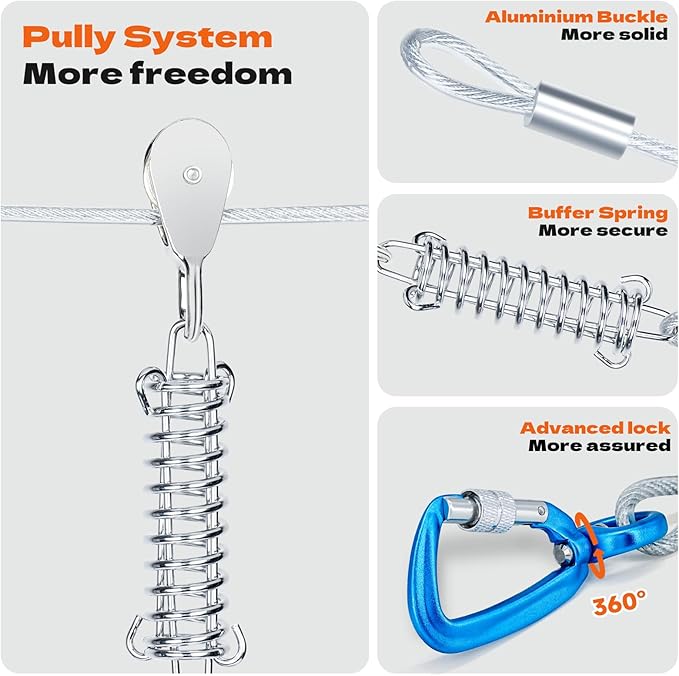 - Smart Dog Trolley System:lnstal between trees or wallin 15minutes (no toolsl).Includes step-by-step visual guide+QR video tutorial.Compact carry pouch fits in camping gear for adventures beyond the yard leash for dogs outside