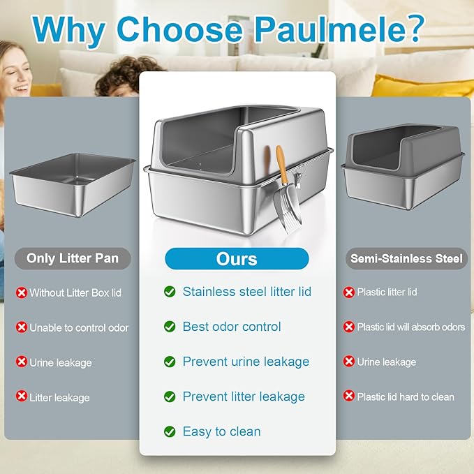 - Why Choose Paulmele:We replaced the plastic lids on the market with stainless steel to solve the problem that plastic lids still absorb odors and are difficult to clean. The all stainless steel cat litter box is easy to clean, does not absorb odors, sturdy and durable, can brings great convenience to your life